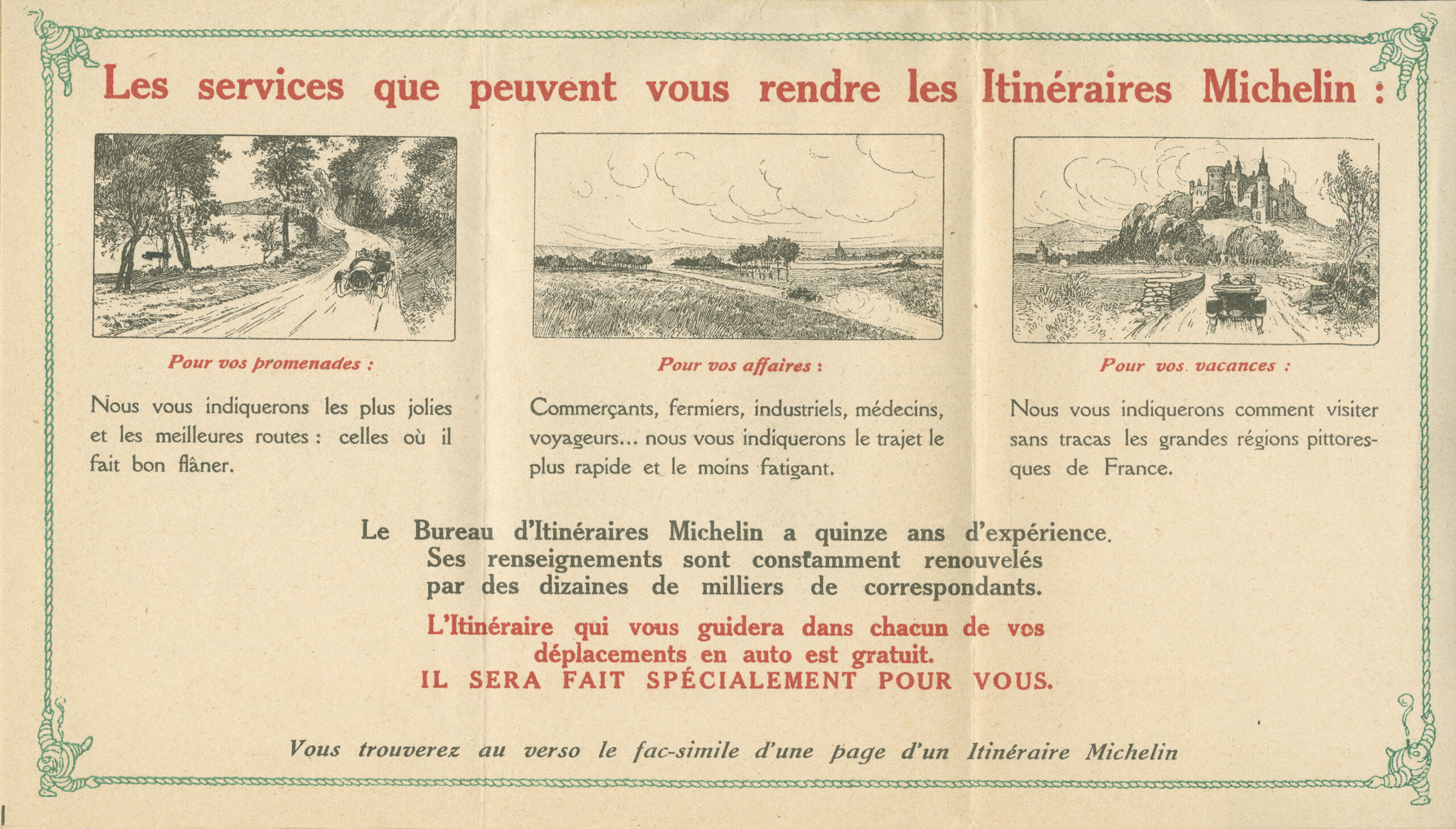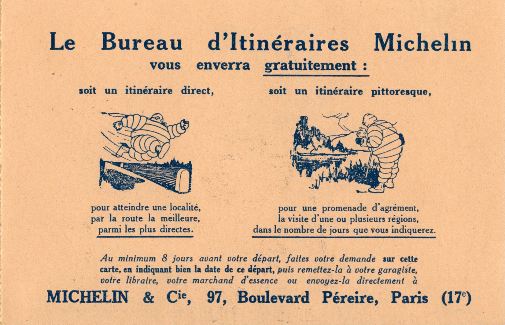 L'automobiliste indique par courrier ou par téléphone la localité de départ et la localité d'arrivée et Michelin se charge de lui répondre en décrivant de façon détaillée la route à suivre. Les feuillets dactylographiés comportent des indications de sécurité ainsi que les curiosités touristiques. Ce service, déjà gratuit, est l'ancêtre de ViaMichelin.